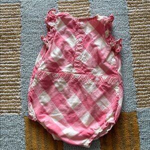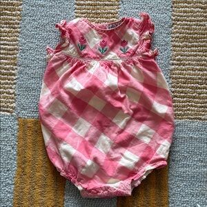100 percent cotton romper. The fabric is very soft. In a pink gingham with ruffled sleeves and 3 tulips embroidered in the front