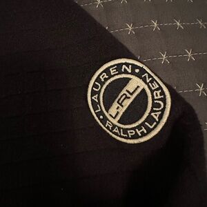 Chic black bomber jacket by Ralph Lauren. Features a stylish yellow interior accent. Ideal for versatile wear.