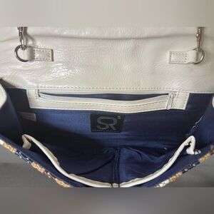 This Sondra Roberts shoulder bag exudes a retro boho charm with its burlap woven striped design and large buckle accents. The off-white handle adds a touch of elegance to the multicolored exterior, making it suitable for travel, casual outings, or business events. The medium-sized bag features a lined interior with pockets, a removable strap, and silver hardware, offering both style and functionality for women looking to add a vintage flair to their outfit. Some wear on the shoulder strap and front buckle area, please see photos. Beautiful woven design!