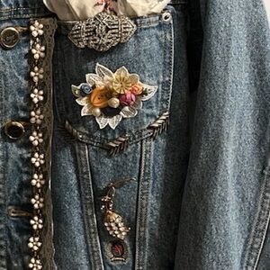 • Mix of vintage brooches, buttons, lace, pearls, rhinestones, and found objects—true maximalist upcycle art!