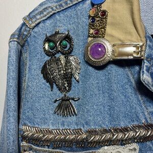• Front covered in hand-sewn treasures: big owl brooch with green eyes, lace patches with floral beadwork, pearl chains, tiny flowers, buttons clusters, fringe, feathers, small animal/pendant charms (including owl, cat, Golden kitten,Colorful bouquet), Colored buttons ,rhinestones, sequins, and more