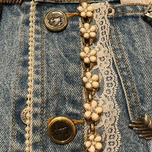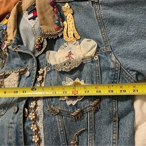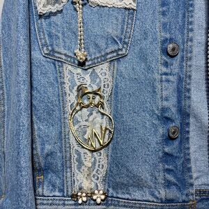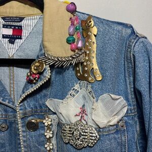 Super unique handmade statement piece! Originally a classic Tommy Hilfiger blue denim trucker-style jacket (likely women’s or unisex crop fit from the 90s/early 2000s), fully transformed with tons of eclectic, maximalist DIY details. Perfect for Y2K revival, boho, hippie, festival, cowgirl aesthetic, or just standing out in a crowd.
