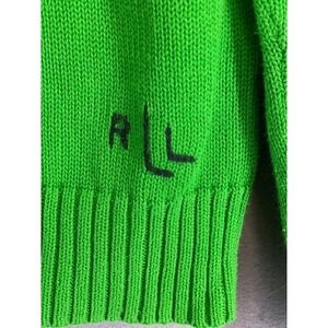 A Lauren Ralph Lauren crewneck sweater in vibrant green with an American flag patch. This knit top features a classic ribbed crew neckline, cuffs, and hem. The embroidered RL logo appears on the lower right side. Perfect for casual outings, patriotic holidays, or relaxed weekend wear. In "like-new" condition with no snags, tears, odors, stains or damage.