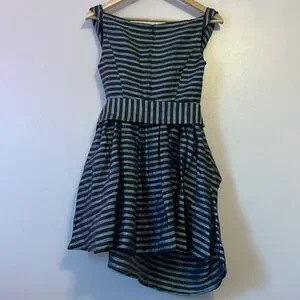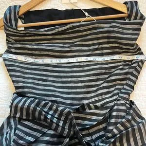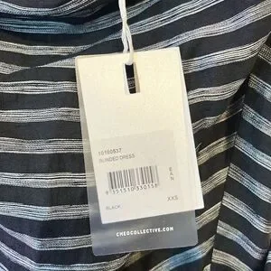 Elevate your wardrobe with this chic New With Tags C/MEO Collective Blinded Dress. The black and white stripes and pleating create a flattering silhouette, while the belted waist adds a touch of sophistication. Perfect for a cocktail party or special event.