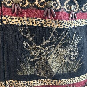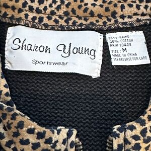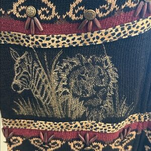 Chic vest with leopard print collar and trim. Zippered front with bronze tone zipper pull. Bronze tone button and bead detailing. Animal print embroidered on the front. Such a cool and unique piece. Wear on its own or perfect for layering. Size Medium