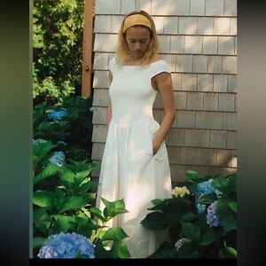 The off-the-shoulder neckline and short sleeves add a touch of bohemian style, while the smocked waist and midi length create a flattering silhouette.