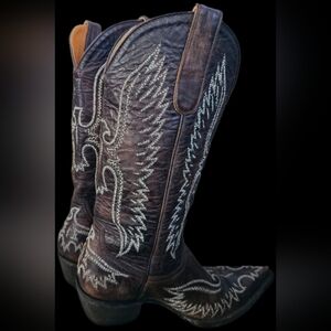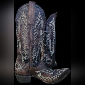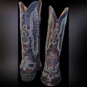 Authentic Old Gringo women’s western boots featuring bold eagle stitching on the shaft. Crafted from distressed brown leather with classic western embroidery and a pointed toe. Beautifully worn-in with rich character and patina — exactly what Old Gringo boots are known for.