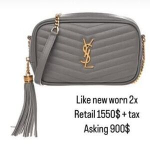 Chic Saint Laurent crossbody bag in gray. Features gold logo and tassel. Perfect for any occasion.