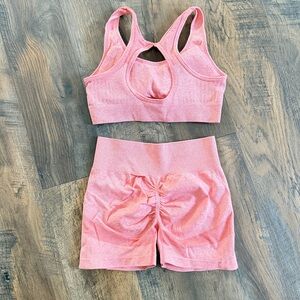 The athletic workout set includes a butt booty conturing biker short and sports bra. Color is barbie pink