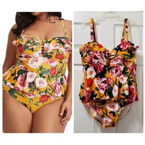 Torrid Plus Size 2 Roses Wireless One Piece Peplum Lattice Lace Up Swimsuit 2X