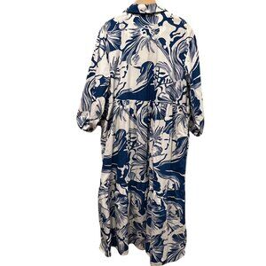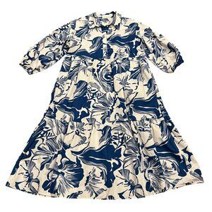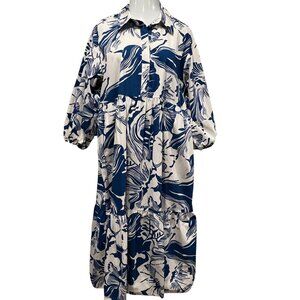 This tiered dress features a relaxed fit, collar, button front placket, 3/5 sleeves with elastic cuffs, side pockets, and a midi length. Excellent condition, washable, bright blue and white floral, size XL