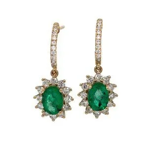 Bold yet elegant dangle earrings featuring oval Zambian emeralds accented with natural diamonds, set in solid 14k yellow gold for a timeless statement look.