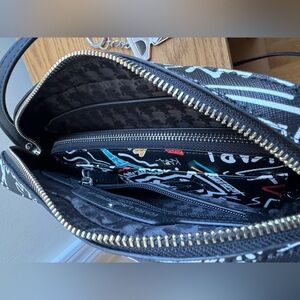 Chic Karl Lagerfeld bag set with bold graphics. Includes matching wallet and keychain. Perfect for fashion enthusiasts.