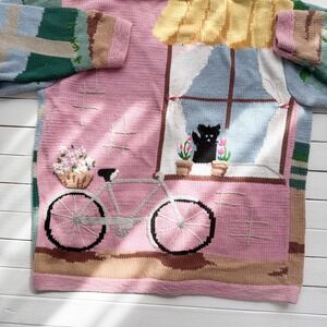 A rare Storybook Knits cardigan in pastel colors, depicting a woman riding a bike along a country road. The back shows the bike leaning against a pink house, with a black cat sitting in the window.