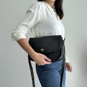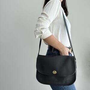 Item: Vintage womens medium leather crossbody shoulder bag with front flap and turn-lock closure.