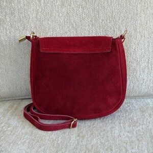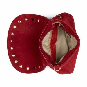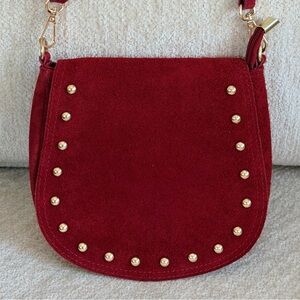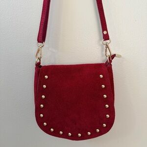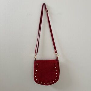 Chic and stylish red suede crossbody bag with studded detailing. Perfect for adding a pop of color to any outfit.