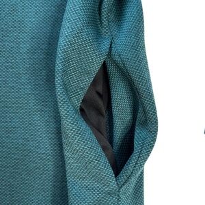 Teal/Green: Textured/heathered knit (waffle-like pattern for breathability), mock collar, black zipper/collar accents, solid performance look