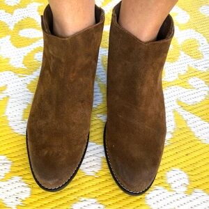 Very Volatile Los Angeles Aldworth Suede Zipper Ankle Bootie Women’s Size 8.5, Whiskey Suede Brown Boots, Cushioned Footbed, Slip On Style with back zip closure, Hand Burnished Suede Leather, Leather Upper, Lining and insole, Western Trend, Heel Height 1 1/2 inches. In good used condition.
