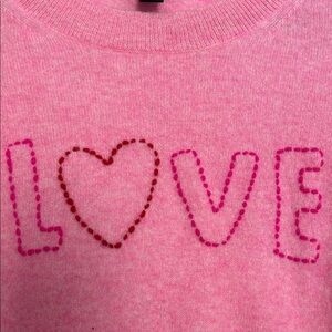 Soft pink sweater with 'LOVE' and heart design. Perfect for a cozy, stylish look.