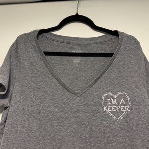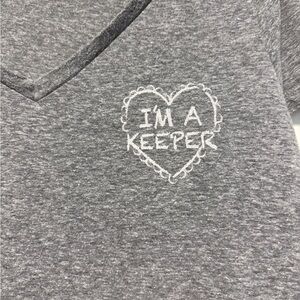 Chic gray V-neck tee featuring 'I'm a Keeper' heart graphic. Ideal for casual wear.