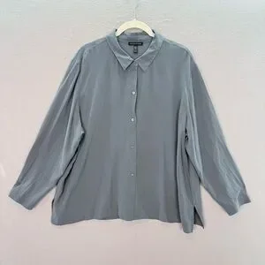 Eileen Fisher -women’s 100% silk crepe button down shirt blue long sleeve top XL