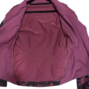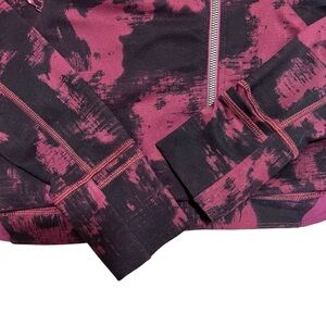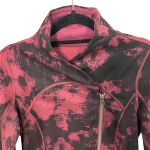 🌟Bold black + berry print in soft, stretchy Luon. •Asymmetrical zip front, curved seams, and high funnel collar. •Two zip pockets and thumbholes.