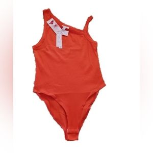 Asymmetrical neckline lends to trendy appeal to this versatile bodysuit.