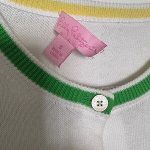 Lilly Pulitzer "Stephanie Shift" engineered dress in the "Hotty Pink Dancing Daffodils" print, paired with a matching "Maralisa Jacquard Cardigan