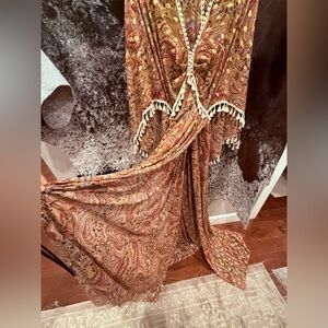 Zebubeyou maternity dress. I purchased this very gently used. In excellent condition. Absolutely gorgeous in person! This dress goes from size small-large. Very long with a super high slit. Has gold patches throughout dress.
