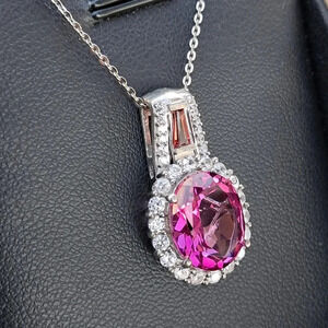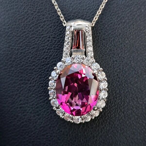 Gorgeous And Rare This 5.91 ctw Oval Pure Pink Topaz Is Surrounded By 1.00 ctw Natural Round Zircon Topped With .20 ctw Natural Garnet Pendant. Hung Beautifully On 20" 925 Sterling Silver Chain.