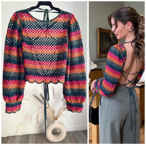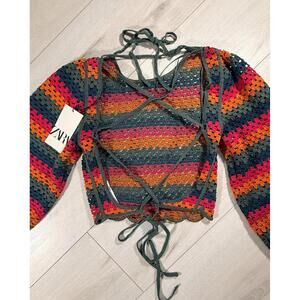NWT Zara Cropped Crochet Long Sleeve Knit Open-Back Top Multicolored Size S