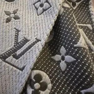 Elegant gray scarf with iconic Louis Vuitton monogram design. Features fringe detailing.