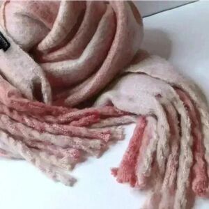 Stylish pink ombre scarf with fringe detail. Perfect for adding a pop of color.