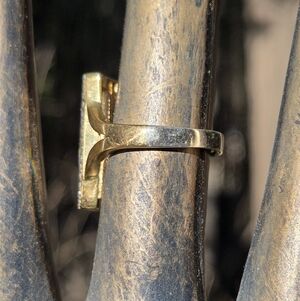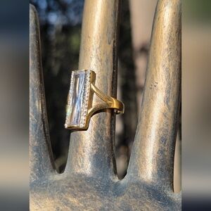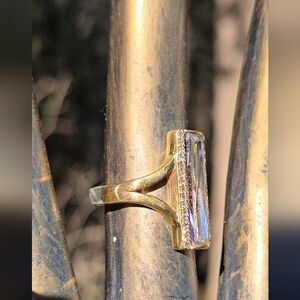 This is a STUNNING piece from my personal collection that I made in 2019 for my Deep Kharma Collection and never wore. This is a gorgeous crisp baguette cut quartz surrounded by crisp white topaz. This stone seems to change color in different lighting. It can be lavender, gray pink and crisp clear. As with all of my pieces, this is made with solid 925 sterling silver, dipped in 24k gold and I've added some bronze for strength hold the precious stones for a dramatic look. Please ask me questions and make me an offer! I can't say yes if you don't ask!