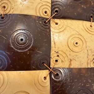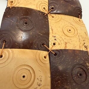 Unique handmade coin purse featuring a patchwork design in natural tones. Compact and lightweight, perfect for carrying coins, cash, keys, or small essentials. Worn as a necklace or small crossbody pouch. Adjustable cord with wooden bead accents. Secure snap closure.