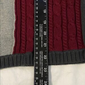 Stylish colorblock sweater featuring a patchwork design. Includes shades of red, gray, black, and pink. Perfect for a cozy and chic look.