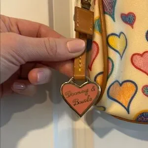 Charming shoulder bag with colorful heart design. Features cream, yellow, red, and blue accents. Perfect for any outfit. In excellent condition with little to no signs of wear.