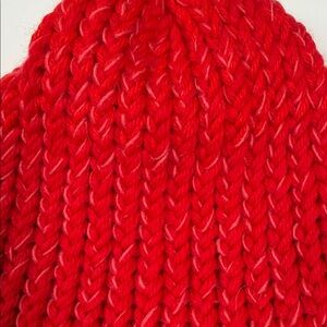 Cozy knit beanie in red and cream. Perfect for chilly days.