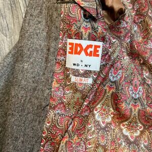 EDGE by WD NY women's slim fit tweed blazer in brown. Features a striking paisley print lining in shades of red, gold, and brown. This tailored jacket offers a sophisticated silhouette with classic blazer styling. The inner lining provides a pop of vibrant pattern, adding a unique touch to the traditional tweed.