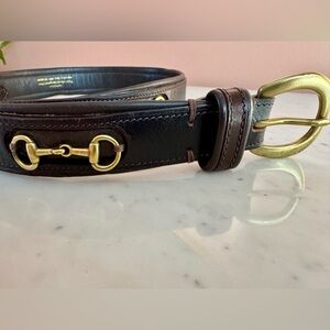 Crafted in deep, rich, chocolate brown, this equestrian chic belt features gold horse bits and a gold buckle.