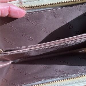 Elevate your style with this chic cream clutch featuring a striking brown strap and floral accent. Perfect for any occasion. It has 24 credit cards slots. In excellent condition.
