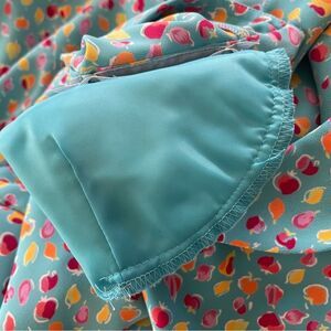 Vintage 90s Liz Claiborne Fruit Print Midi Dress in a turquoise blue shade. Features a full length button front placket (buttons are concealed on the skirt & visible on the exterior of the chest) rounded collar, darts at the bust, short sleeves, & shoulder pads that are removable (snaps in & out see pics 6-7). The back has a double layer at the top with a keyhole tie that adds interest. Print is adorable & this modest dress in ideal for a variety of occasions. In very good preloved condition with minimal normal wear consistent with vintage age. Size 8. Approximate measurements lying flat: 19” from pit to pit & 40” from shoulder to hem. Bundle to maximize shipping!