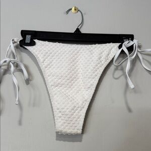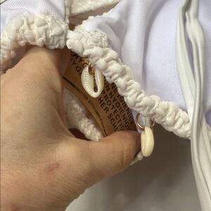 White textured bikini with shell accents. Triangle top with adjustable ties. Stylish and chic.
