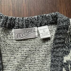 Cozy vintage “Method” jacquard knit cardigan featuring a classic gray and white woven pattern. Soft 100% acrylic fabric with a relaxed, slightly oversized fit and deep V-neckline. Full button front with ribbed cuffs and hem for a timeless silhouette.