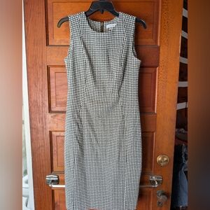 This is a gorgeous, smart, sheath dress that can be dressed up or down. Black and white houndstooth pattern. Mid length. Size 8. Stretchy fabric is comfortable. Long zipper in the back.
