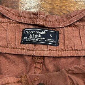 Great condition- no holes or stains. One small spot as shown in picture. Could easily wash out. Abercrombie & Fitch high waisted paper bag belted brick red shorts size small. The waist is elastic and sizing is a little big so could easily fit a medium.