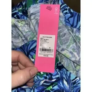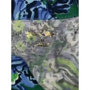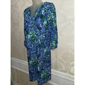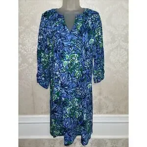 Brand new and never worn Lilly Pulitzer shades of bright blues, greens and white 100% cotton Fairfax dress in Abaco Blue Turtle Awe. Features rounded neckline with V notch at center front. Sewn flat tuxedo style pleating detail on both sides of V. 3/4 length straight cut sleeves with fabric tab and gold button detail at ends. Cut in a nearly straight line through body length, falling to top of knee. Medium weight jersey style fabric. Stretch available. Women’s size medium with