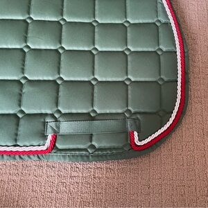 Green quilted Equine Couture English saddle pad with red and white piping, crown and shield patches on each side and girth straps.