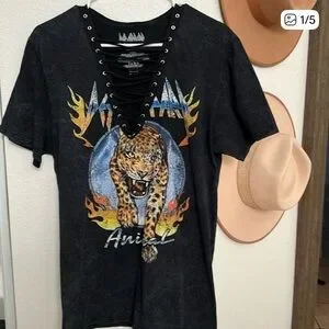 Upcycled Handcrafted Def Leppard Graphic Lace-Up T-Shirt, Deer IVIE, Size L