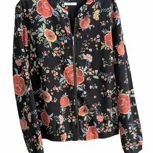 Add a pop of botanical charm to your outfit with this stunning Promod bomber jacket. Featuring a vibrant, multi-color floral print on a sleek black background, this jacket offers an "embroidered" aesthetic that transitions perfectly from spring to fall.